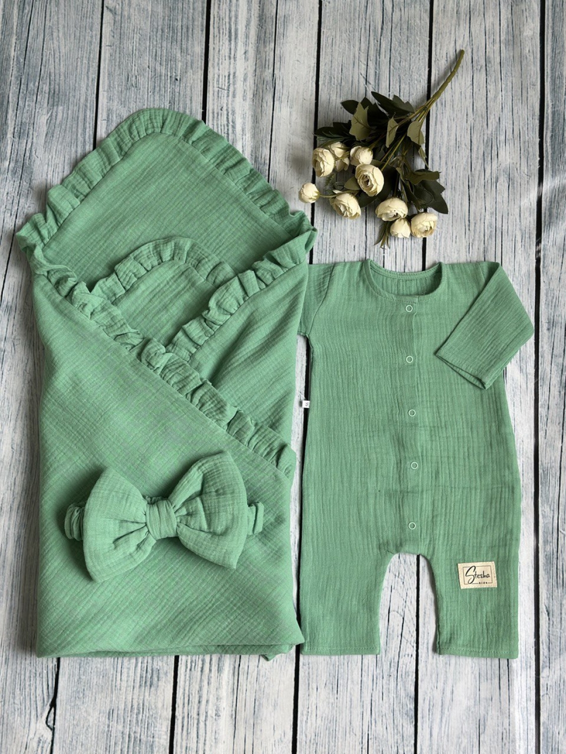 Теги: Купить детские конверты, комбинезон оптом, детские конверты на выписку оптом. 335-ОЛ. Комплект из детского комбинезона, р 56 и конверта муслин, хлопок 100% 90/90 см, олива цена,отзывы официальный сайт "Стеша Белогорск"