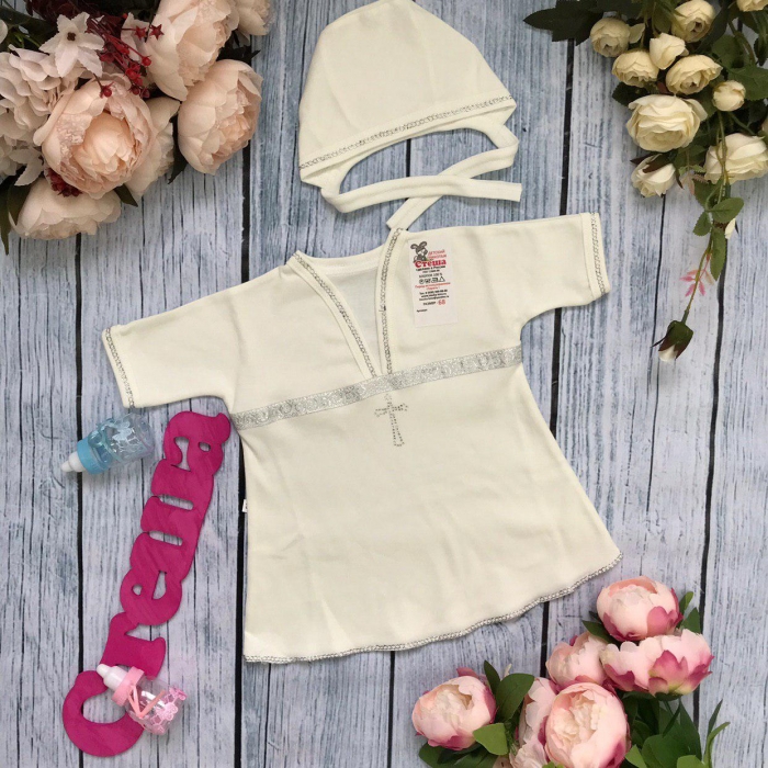 Теги: Купить оптом крестильную рубашку. 169. Крестильная рубашка с чепчиком (серебро), хлопок 100 % интерлок 62,68,74,80 цена,отзывы официальный сайт "Стеша Белогорск"